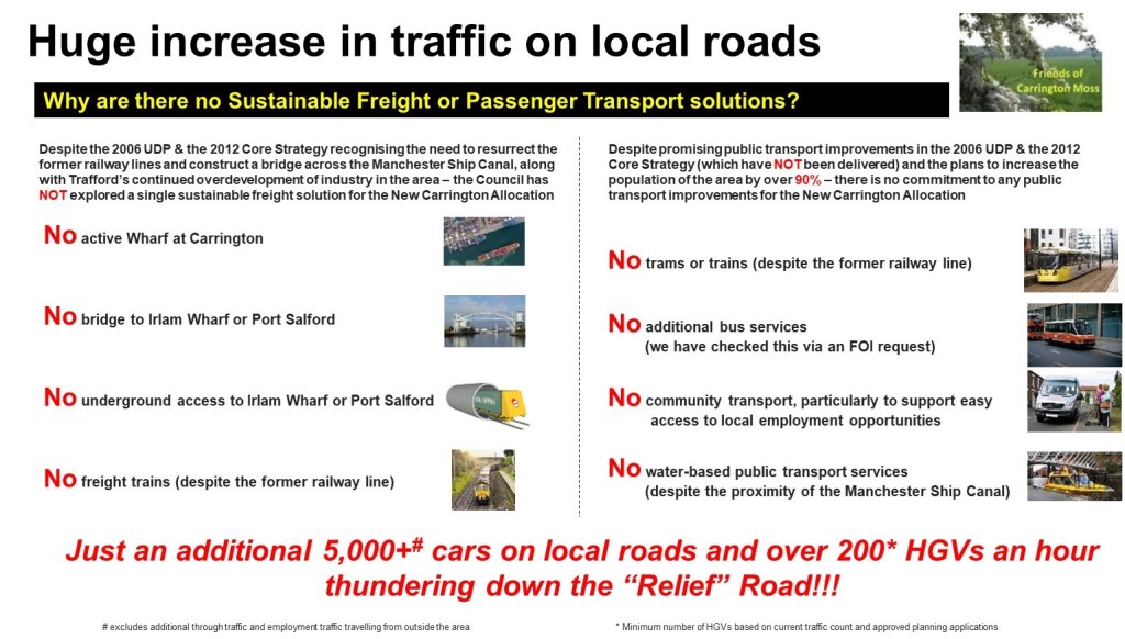 Given their plans for extensive development in the area, Trafford should have consulted with residents about the implementation of sustainable passenger and freight transport options, before deciding on a new road (across a peat moss, grade 2 agricultural land, woodland and wetland habitats).