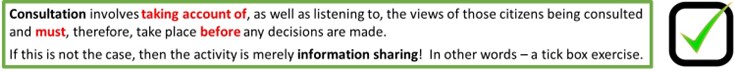 | Carrington Relief Road Options Report, December 2020 | This report specifically related to proposed consultation about the CRR, with the report clearly demonstrating that Trafford are not aware of the meaning of consultation (see graphic below)! |