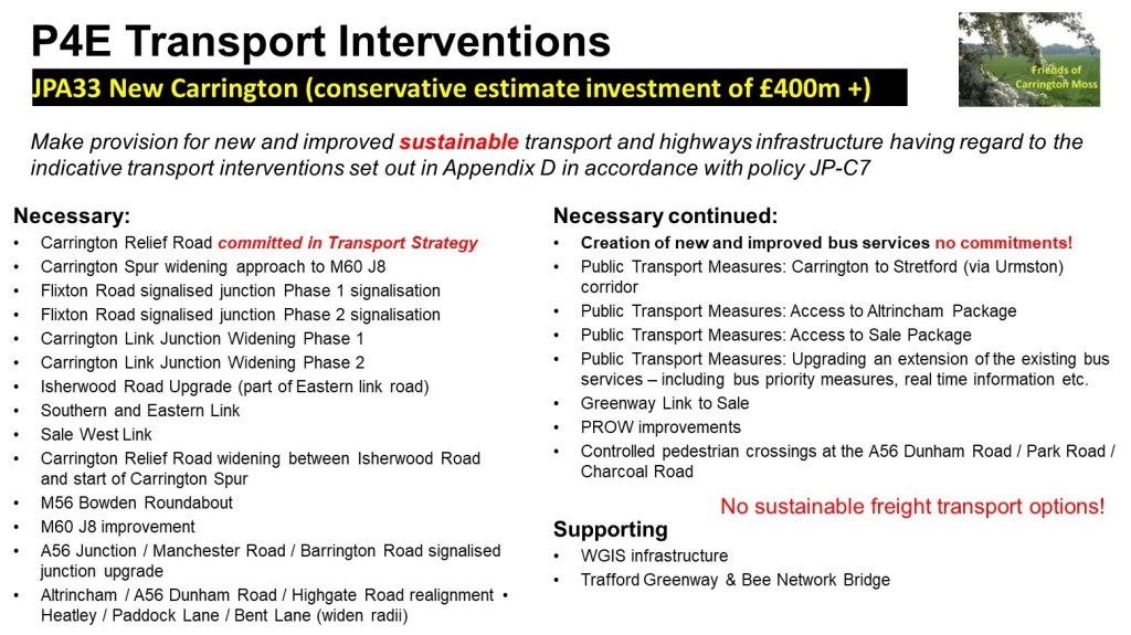 There is very little information in the document about the costs/funding of the overall “strategy”.  There are only figures related to the Carrington Relief Road (£76.5m) and the overall Greater Manchester Transport Strategy 2040 (£1.1b).  Our own very conservative estimate puts the overall cost of the “Necessary Transport Interventions” for the New Carrington development to be over £400m, see Appendix D (page 708) and listed in the graphic above.
