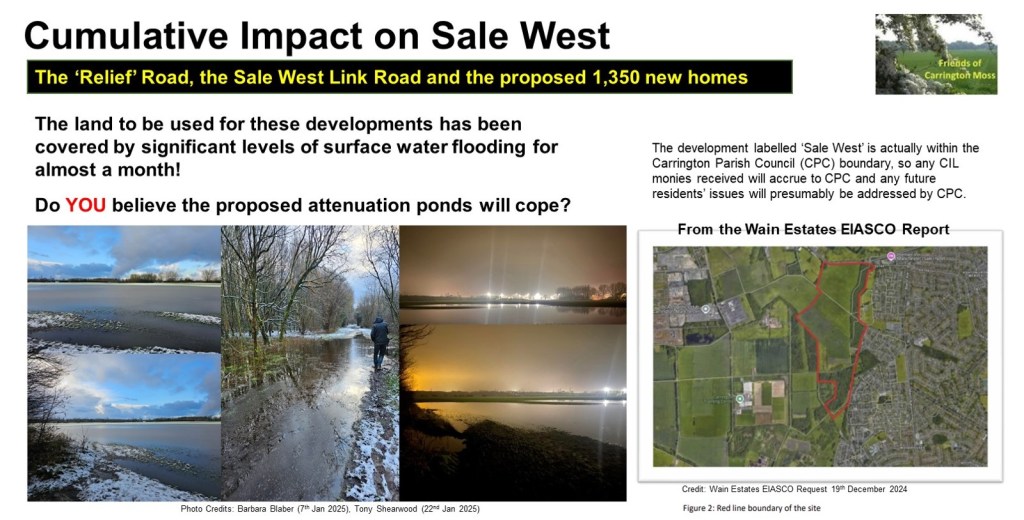 We do, though, have major concerns about the part of the route which runs across Carrington Moss. Not just because of the impact it will cause to Sale West residents and the lack of benefits to surrounding communities, but also because of the harm it will cause to the 335-hectare peat moss (described by Natural England as irreplaceable and restorable), the productive Grade 2 agricultural land, the extensive woodland and the wetland habitats. All of which are essential to a sustainable future for our children and grandchildren. The road, and the wider plans for New Carrington, will also significantly impact 15 sites of biological importance and a site of special scientific significance.