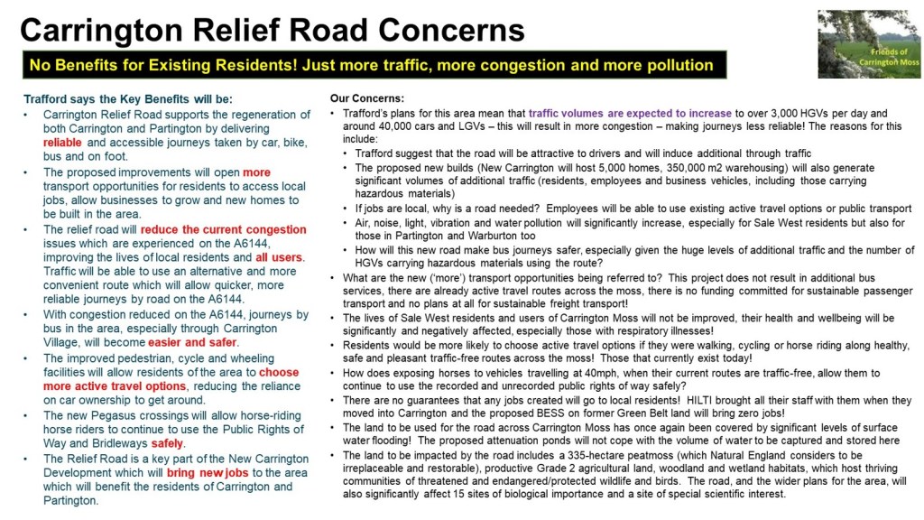 There have been numerous concerns raised about the route of the Carrington ‘Relief’ Road across Carrington Moss, as it will cause significant harms to both human and wildlife populations and several of our members have suggested that there is a significant lack of awareness shown by those making the decisions about this proposal.