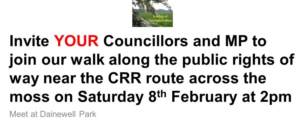 With this in mind, we hope you will all join us on a walk along the public rights of way near to the Carrington Moss part of the route for the new road. We plan to meet on Dainewell Park on Saturday 8th February at 2pm.