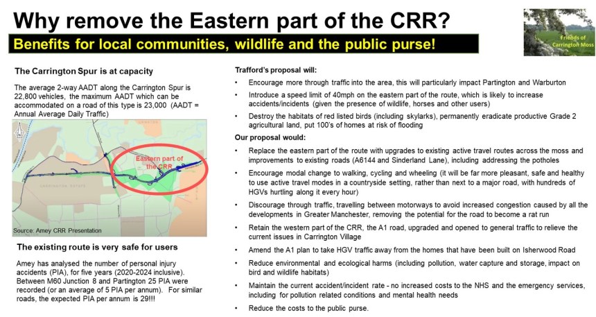 January 2025 Carrington Relief Road Consultation Opens – the FIRST consultation about the CRR! The costs have now escalated to £130m – we ask which organisation(s) is/are on the hook for any unfunded but committed spend!