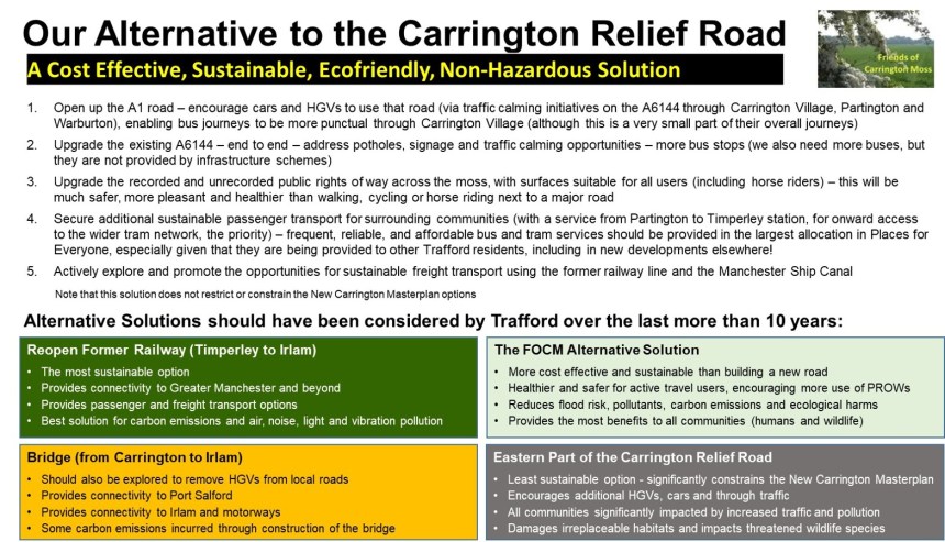On 12th January 2022, the proposals for the Carrington Relief Road were presented to Trafford’s Scrutiny Committee. You can watch the presentation and the response from members here. After that presentation, FOCM developed a number of blogs to correct the misinformation, fill the gaps and provide the viewpoint of the KEY stakeholder – Trafford residents.