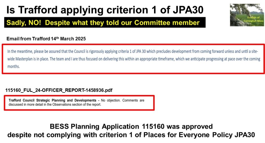 Criterion 1 has no such restrictions. Yet, despite the masterplan NOT being developed, AND a ‘suitable compensation strategy’ NOT being in place Trafford has approved a planning application (115160) on 19.9 hectares of very deep peat!