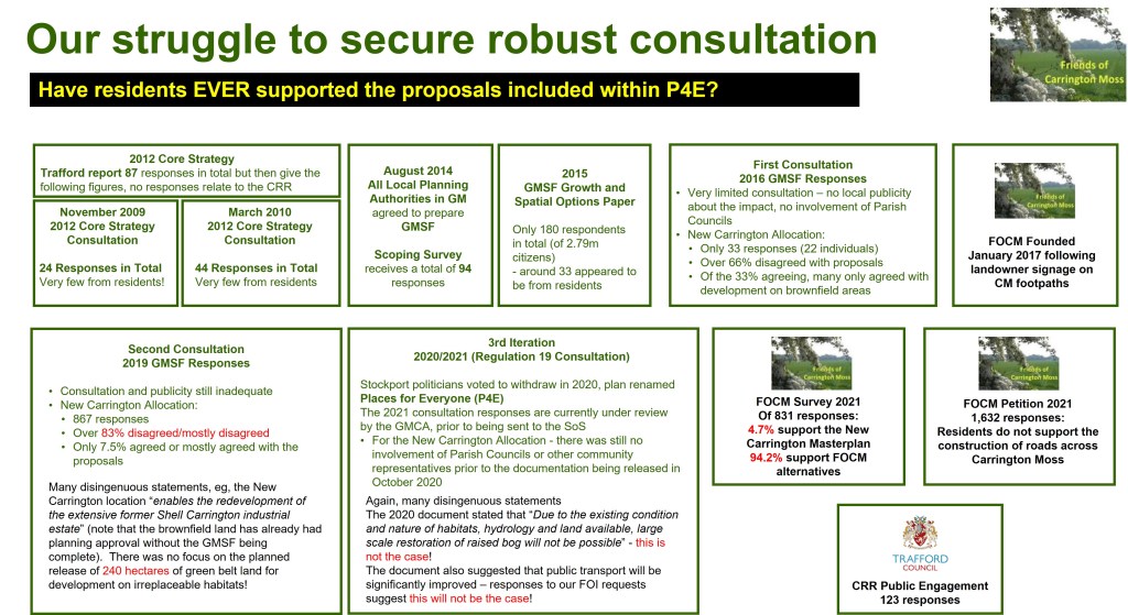 The consultation process for PfE was abysmal. Residents were not made aware of the environmental and ecological harms proposed, nor of the size and scale of the proposals (which were originally 16,000 houses and 7m m2 employment space). In the 2019 consultation, there were over 150 documents (comprising over 14,000 pages) to review. These documents were full of factually incorrect and/or disingenuous statements. The Friends of Carrington Moss was actually constituted following the introduction of signage on the public rights of way that stated ‘Trespassers will be prosecuted’. A clear indication that the developer considered the allocation to be a done deal!