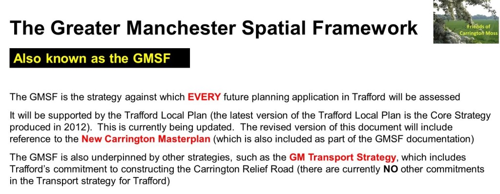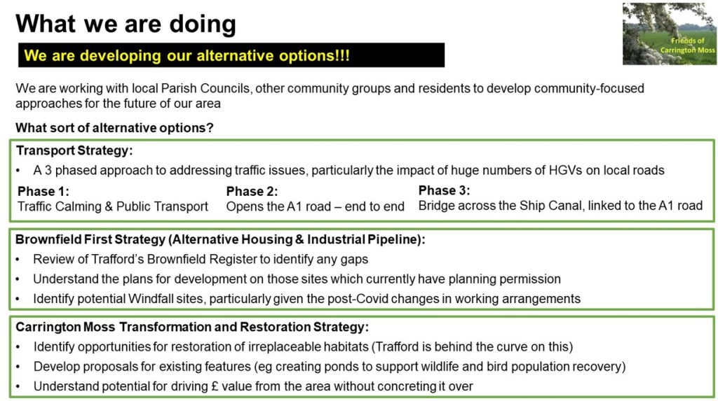 At our public meeting on 28th December 2020, we provided an update on the latest information we have about the GMSF, Trafford’s Local Plan and our alternative strategies for Carrington Moss. We recorded the presentation and you can listen to it on the button below.