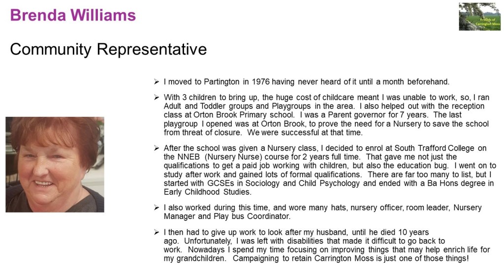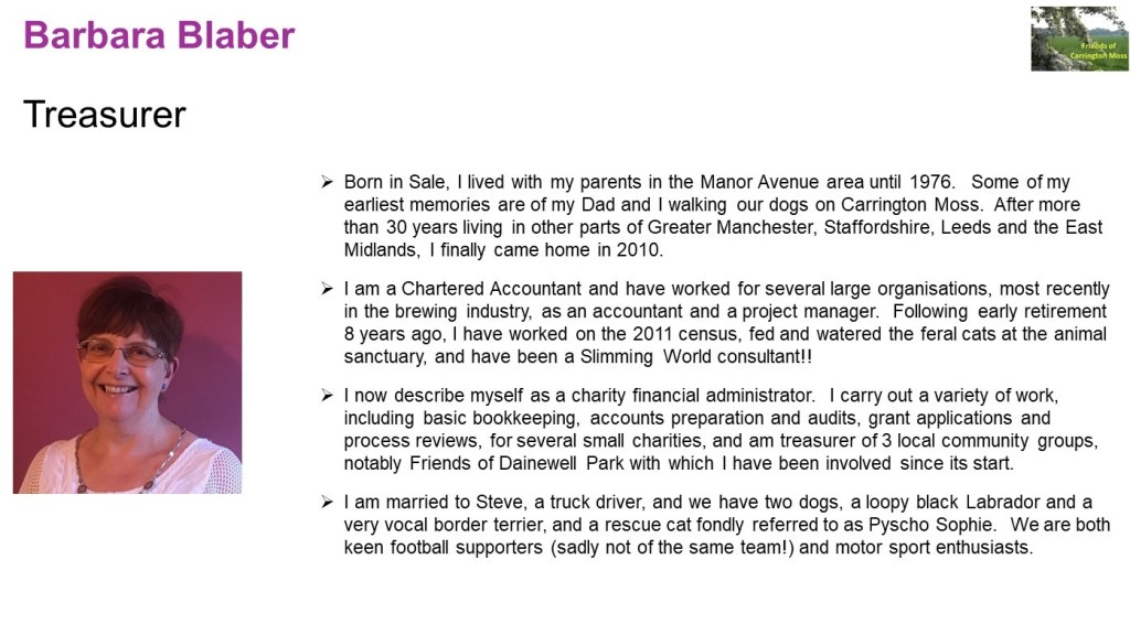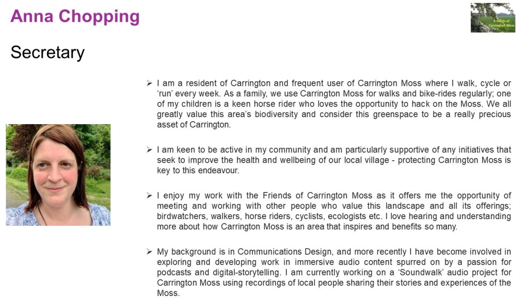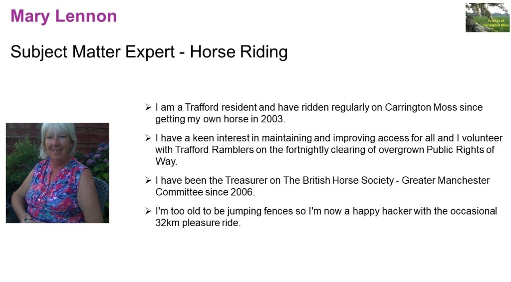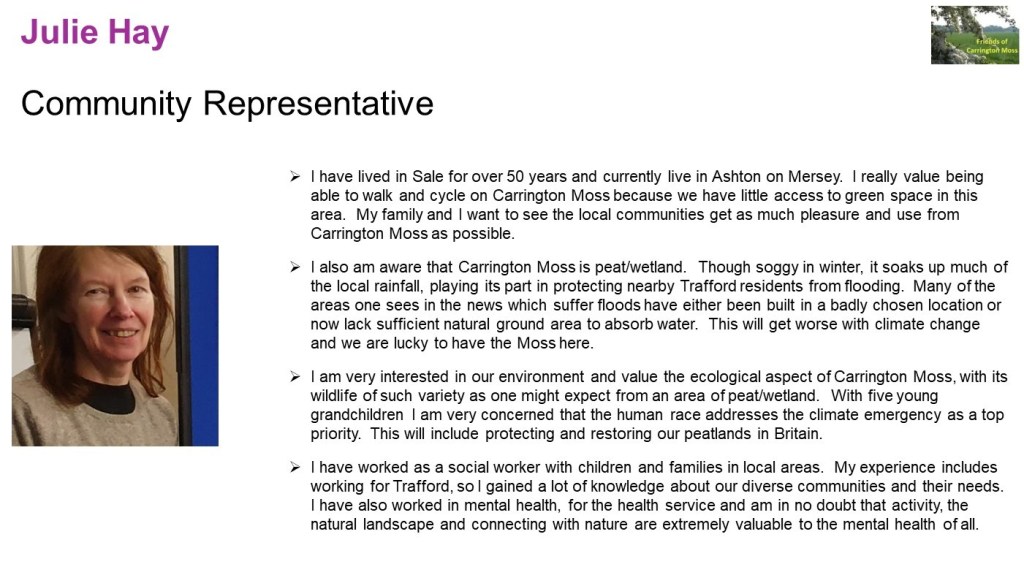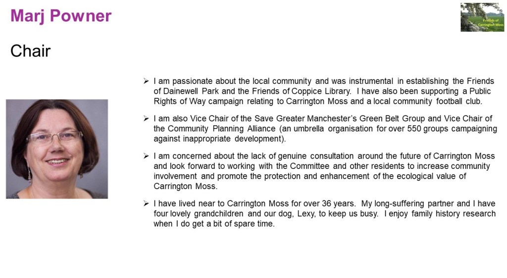 We look forward to working with you to preserve and enhance this wonderful green space for future generations of Carrington Moss users
