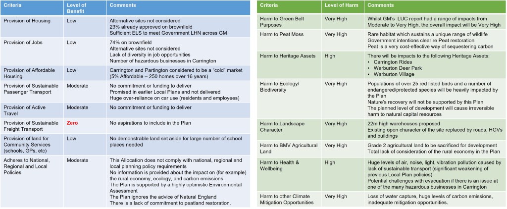 - Natural England (NE) wrote to the planning inspectors in June 2023 (OD42), stating that there is extensive and restorable deep peat within allocation JPA33 (New Carrington), that the deep peat should be considered to be an irreplaceable habitat, and that “the combination of the location and the extent of development proposed by the allocation policy means the proposed development is incompatible with avoiding the deterioration of this irreplaceable habitat”