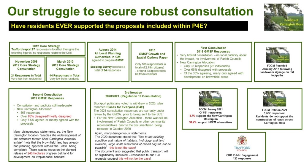 Whilst the production of this “strategy” is to be welcomed, there has been no involvement of the community in determining the Vision, or the aspirations, and there is nothing in the document that suggests that communities will be engaged as the “strategy” evolves in the future! It is, therefore, not a surprise that it merely continues to promote car/HGV-dependency, leaving a legacy of huge levels of air, noise, light, vibration and water pollution (to say nothing of the carbon emissions), that will result in poorer health outcomes for residents and higher costs to the public purse. There is a reference to a specific consultation about one initiative, the Carrington Relief Road, but that was supposed to commence in January 2024, so is already behind schedule.