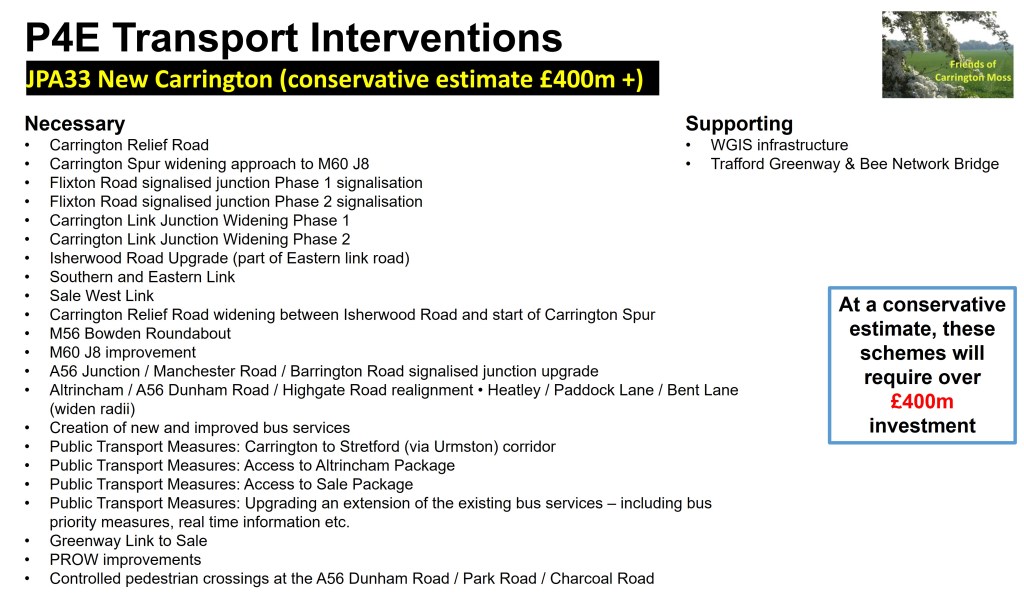 There is very little information in the document about the costs/funding of the overall “strategy”. There are only figures related to the Carrington Relief Road (£76.5m) and the overall Greater Manchester Transport Strategy 2040 (£1.1b). Our own very conservative estimate puts the overall cost of the “Necessary Transport Interventions” for the New Carrington development to be over £400m, see Appendix D (page 708) and listed in the graphic above.