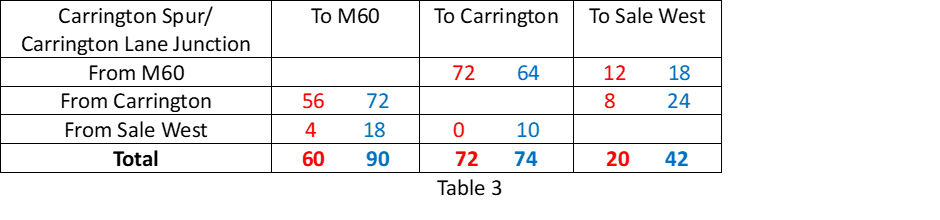 We have been collecting our own traffic data at key junctions in Carrington and Sale West for several years, but to verify the figures in the report, we collected some specific data in February and March 2024. The results of our survey are as follows: