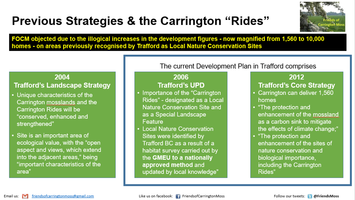 The GMSF/P4E is at odds with Trafford’s current Local Plan, which describes Carrington Moss as an area to be “conserved, enhanced and strengthened”, an “important area of ecological value”, a “designated Local Nature Conservation Site” and a “Special Landscape Feature”. The Local Nature Conservation Sites were identified by Trafford following a habitat survey carried out by the GMEU to a nationally approved method and updated by local knowledge. The documents also describe the importance of the “protection and enhancement of the mossland as a carbon sink to mitigate the effects of climate change” and “the protection and enhancement of the sites of nature conservation and biological importance, including the Carrington Rides”.